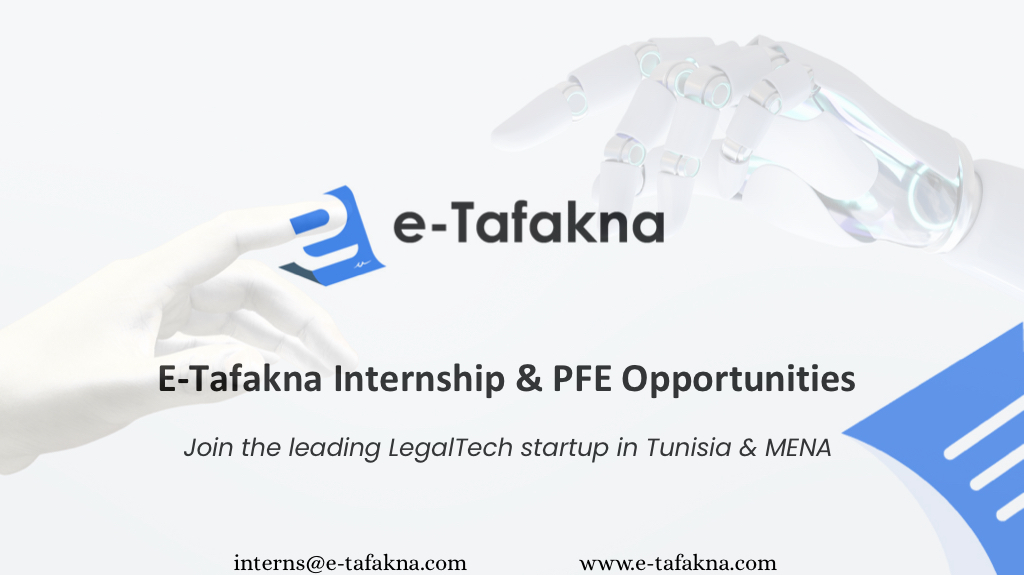 Pionnière dans la transformation numérique du secteur juridique en Tunisie et dans la région MENA, E-Tafakna propose une expérience unique à travers ses projets de fin d’études (PFE) et stages. Cette startup dynamique allie expertise juridique et technologies de pointe pour révolutionner l’accès et la gestion des services juridiques, offrant ainsi aux étudiants une occasion précieuse de contribuer à une innovation à fort impact.