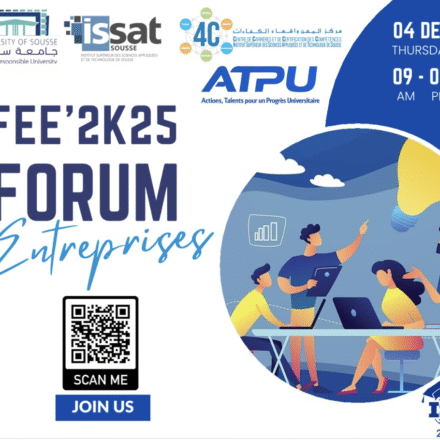 Le Forum Entreprises/Étudiants FEE’2025, organisé par le Centre de Carrière et de Certification des Compétences (4C) en partenariat avec la Direction des Stages de l’ISSAT Sousse et l’Association Tunisienne pour le Progrès Universitaire (ATPU), se tiendra le jeudi 4 décembre 2025 à l’ISSAT Sousse. Cet événement incontournable offre une journée exceptionnelle de rencontres, d’opportunités et d’innovation, sous le slogan « Explore, connecte, démarre ta carrière ! ».